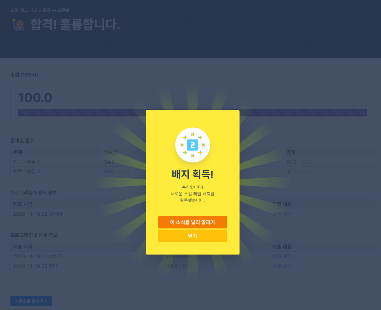 Lv2 배지를 획득한 것으로 끝난 건 아니지만 Lv4 배지를 얻는 그 날까지 계속해서 문제를 풀어나갈 예정입니다.